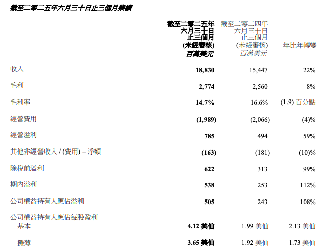 8月14日,联想集团(00992.HK)公布截至2025年6月30日的2025/26财年第一季度业绩,整体营业额及盈利均实现显著增长。财报显示,该集团当季营收同比增长22%至188.3亿美元,创下历史同期新高净利润为5.05亿美元,同比增长108%;非香港财务报告准则下净利润3.89亿美元,同比增长22%。