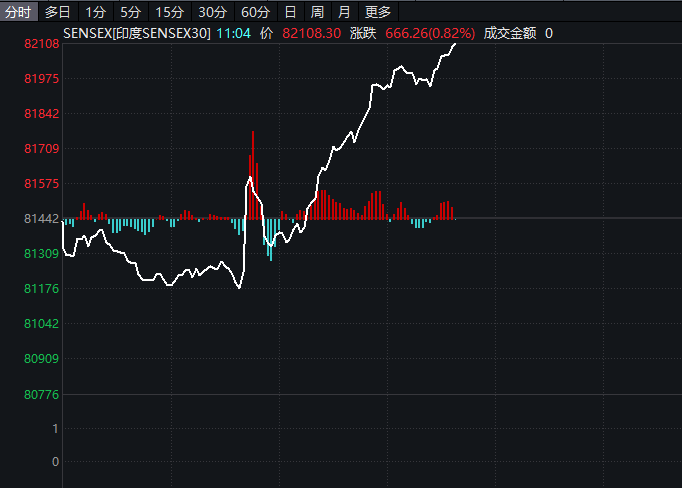 在印度央行大幅降息并下调存款准备金率后,印度股市直线拉升,SENSEX30指数涨0.82%,此前下跌0.3%。权重股方面,BAJAJ FINANCE涨超3%,印度国家银行涨超1%,HDFC BANK涨近1%,信实工业涨0.29%,印度联合利华涨0.25%。