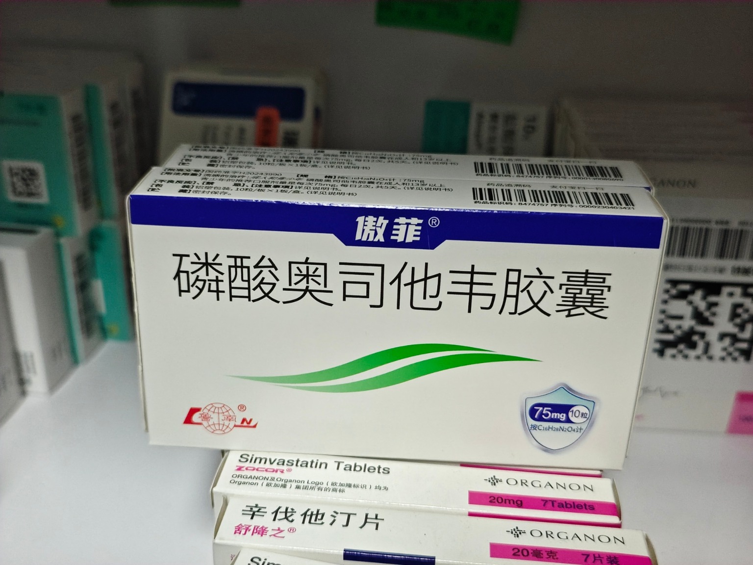 药店在售的奥司他韦原研药“达菲”、国产仿制药“傲菲”、“可威” 图片来源:每经记者林姿辰摄