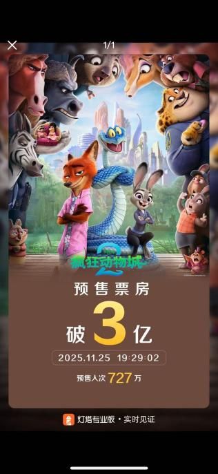 11月25日晚,《疯狂动物城2》预售票房破3亿元,刷新中国影史进口动画影片预售纪录。次日(11月26日),正式上映首日,影片以66.5%的排片占比,拿下当日93.3%的票房份额。